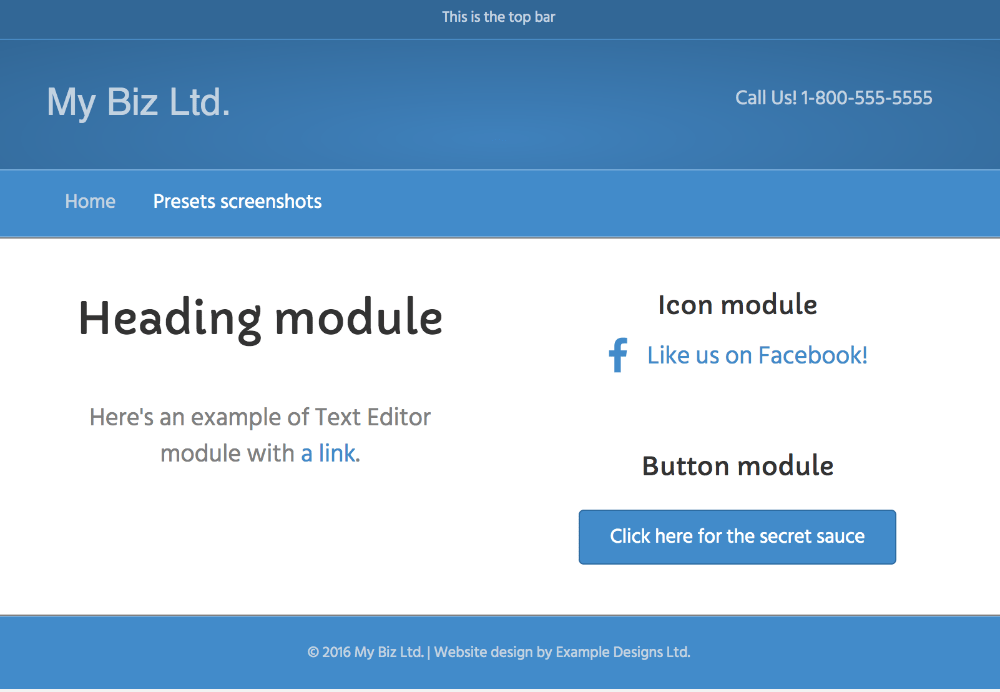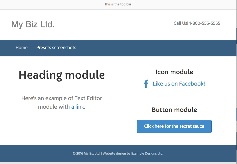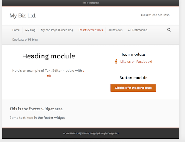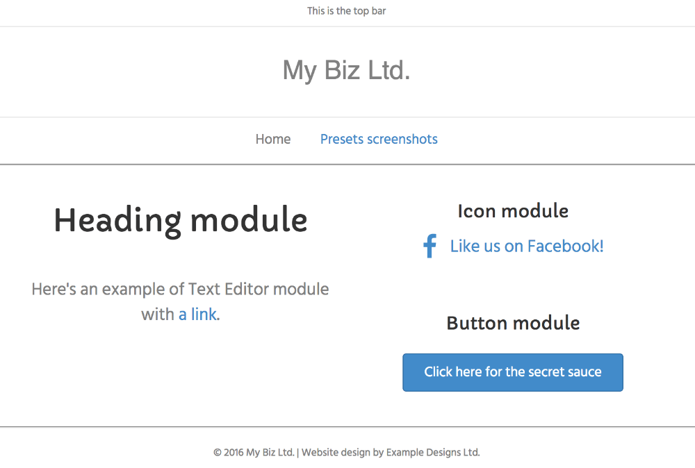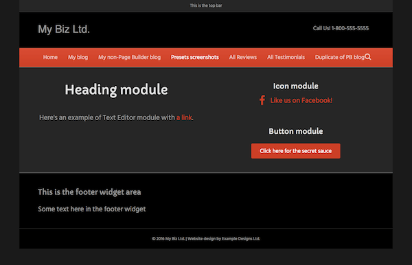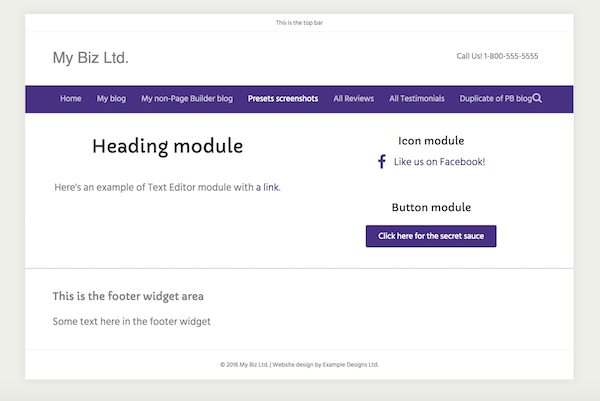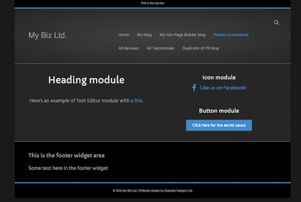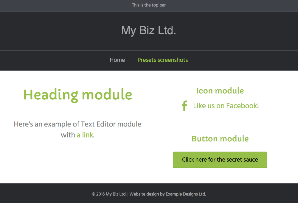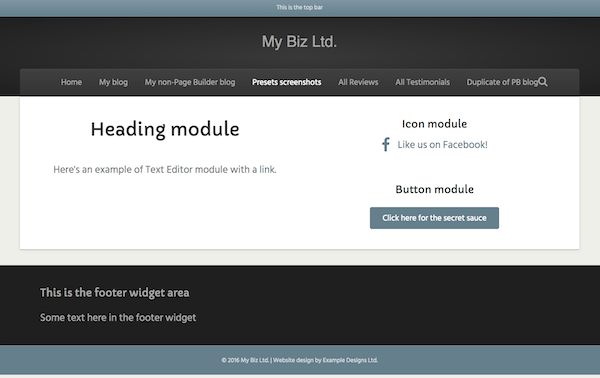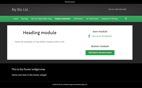 • Layout: Full-width header and footer with a boxed content area. See this article for how to make this preset entirely full width.
