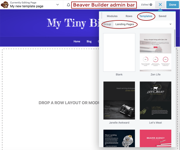 Start with a layout template, prebuilt rows, or a blank page​