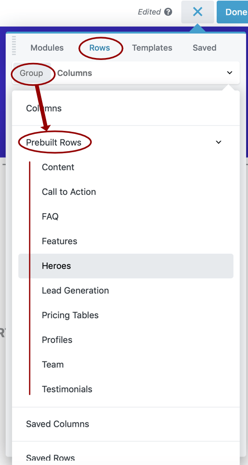 • Add one or more prebuilt row layouts and modify them. Click the Rows tab, in the Group field select Prebuilt rows, then choose a category and drag your selection into the layout. See this article on prebuilt rows.
