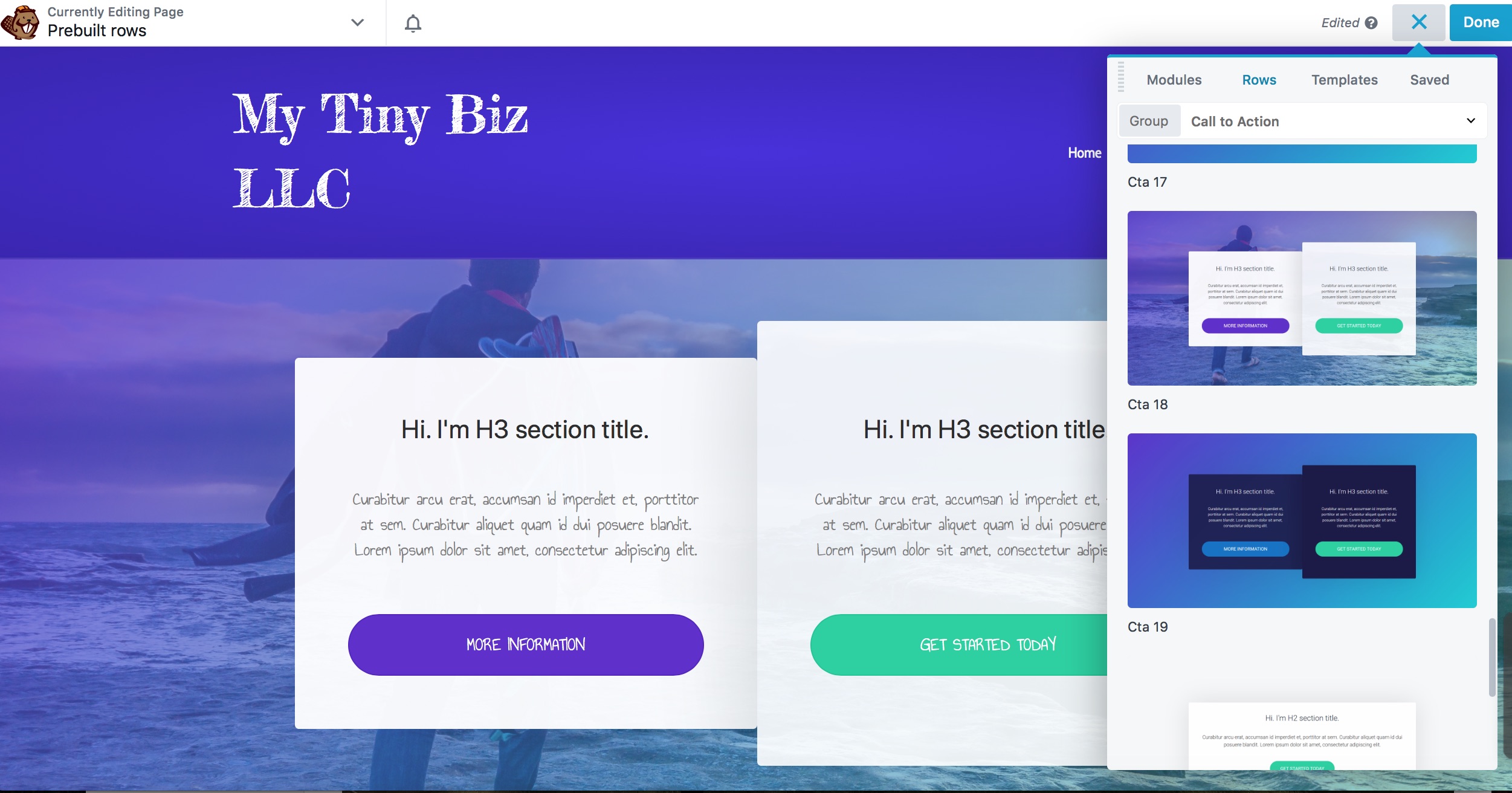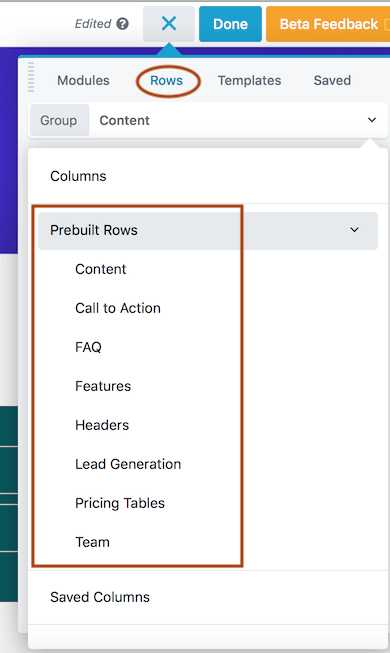 To access prebuilt rows, on the Rows tab of the Content panel, select the group Prebuilt rows, then click a category to see the row thumbnails. Drag one into your layout and modify as you like.