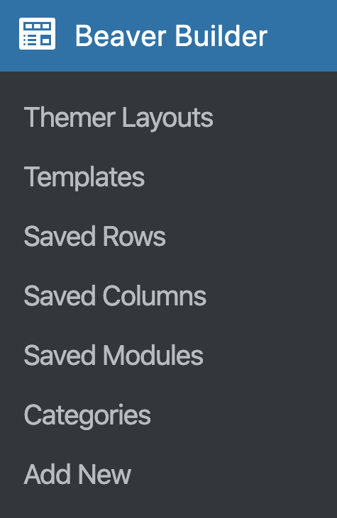 The Beaver Builder menu in the WordPress admin panel lets you create, edit, and delete custom layout templates and saved rows, columns, and modules just as you would any standard post or page. You can also add categories to organize your templates, rows, and modules.