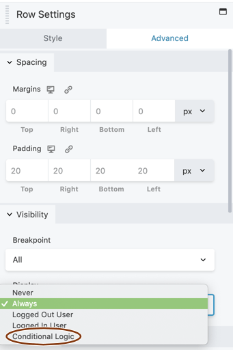 With Beaver Themer installed, in either a standard Beaver Builder layout or a Themer layout, the Display field has an additional Conditional Logic choice, as you can see in this screenshot.