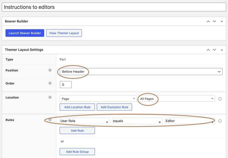 Suppose you want to display a banner at the top of the page with special instructions to editors when they are logged in, showing how to open a page for editing in Beaver Builder, as in this screenshot: