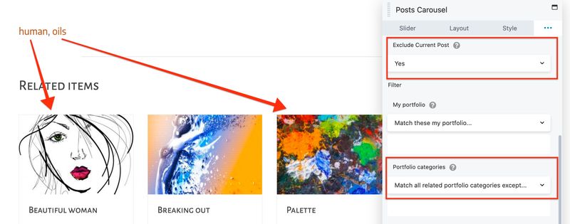 This post is assigned to two categories, human and oils, so the result includes all the portfolio items categorized as EITHER human OR oils. So, for example, you can see an oil painting called Palette, which is not a human subject, but it is an oil painting. If you use the filter Match all related portfolio categories except oils, all of the items categorized as oils are eliminated, including all items categorized as both human and oils. See the section about exclusions for details and an alternate architecture that lets you eliminate oils that aren't human instead of all oils.